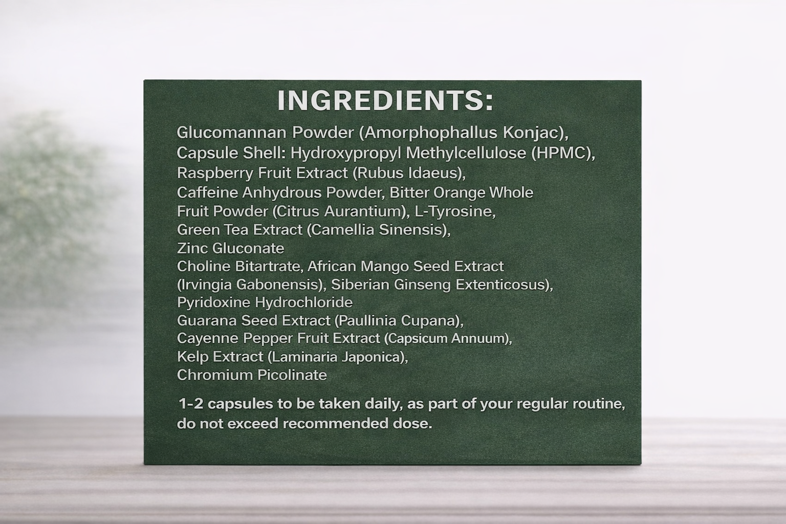 Glucomannan Powder (Amorphophallus Konjac), Capsule Shell: Hydroxypropyl Methylcellulose (HPMC), Raspberry Fruit Extract (Rubus Idaeus), Caffeine Anhydrous Powder, Bitter Orange Whole Fruit Powder (Citrus Aurantium), L-Tyrosine, Green Tea Extract (Camellia Sinensis), Zinc Gluconate, Choline Bitartrate, African Mango Seed Extract (Irvingia Gabonensis), Siberian Ginseng Extract (Eleutherococcus Senticosus), Pyridoxine Hydrochloride, Guarana Seed Extract (Paullinia Cupana), Cayenne Pepper Fruit Extract (Capsicum Annuum), Kelp Extract (Laminaria Japonica), Bioperine (Black Pepper Extract), Chromium Picolinate.