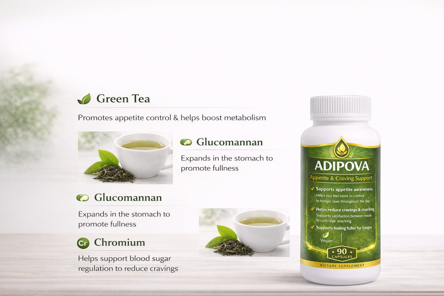 Adipova combines plant-based ingredients chosen for their role in supporting appetite regulation, digestion, and daily balance